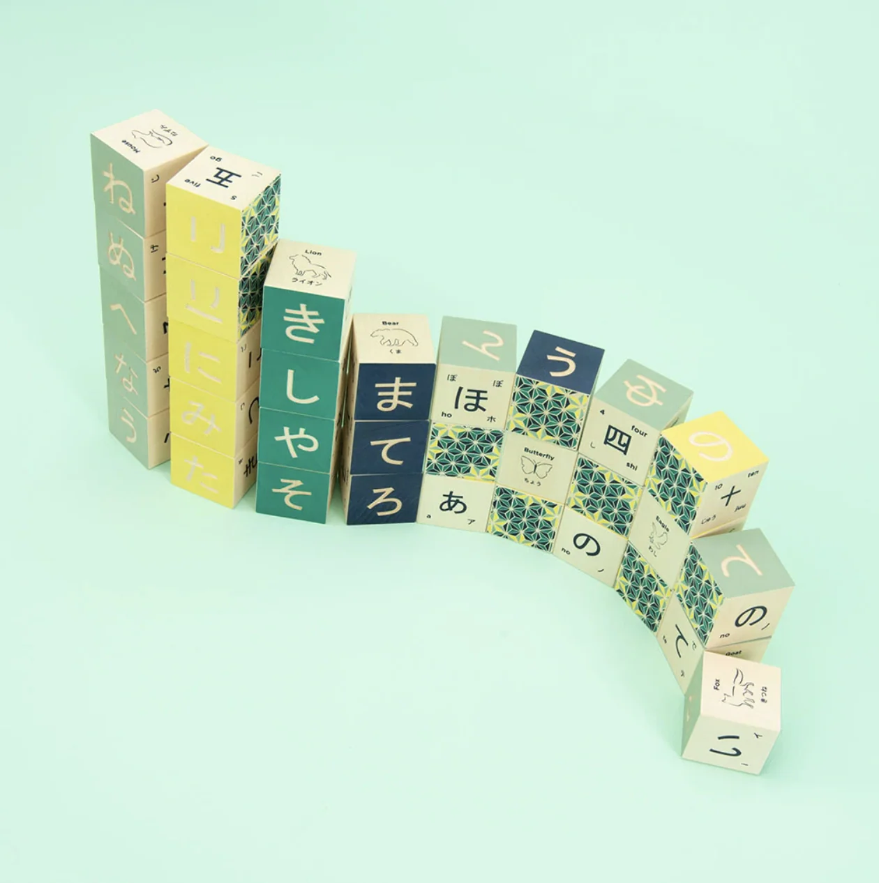 Expand your knowledge of Japan and the Japanese language. This 32-block hand-crafted set features Japanese language symbols. Enjoy the animal pictures paired with their English and Japanese translations. Savor the two debossed sides per block. Delight in the colorful geometric rendition of a field of chrysanthemums.