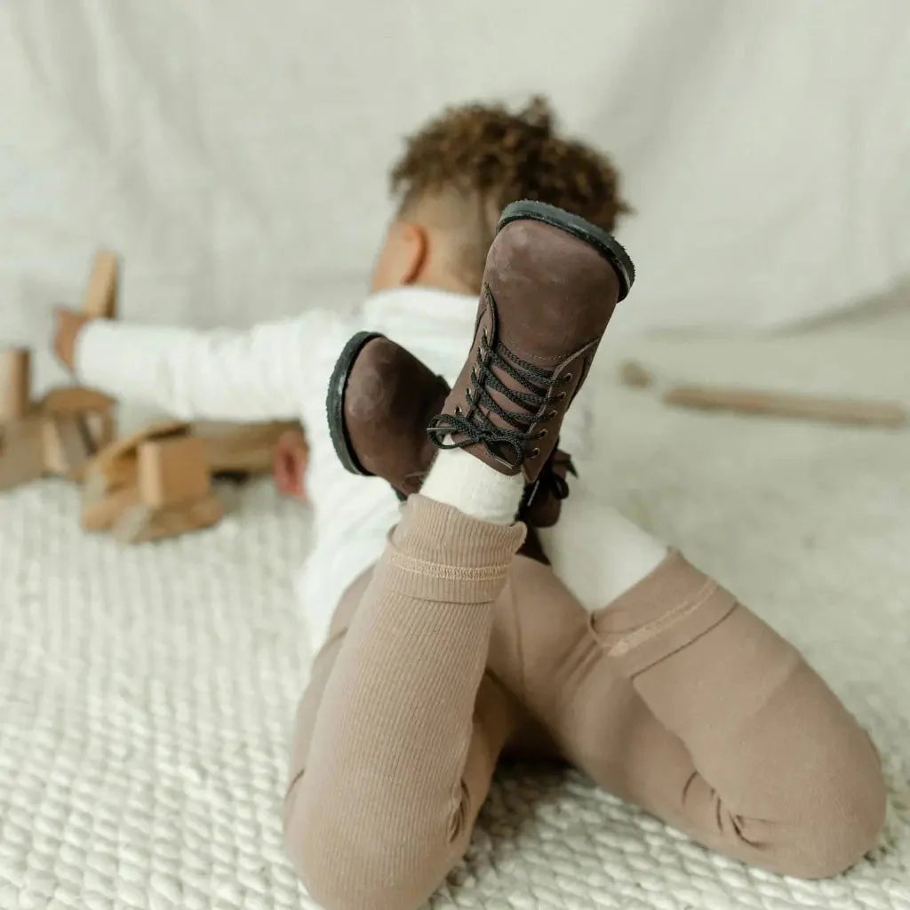 The Levon High Top is made of soft brown nubuck leather and lined with breathable leather and cotton which work together to draw out any moisture. The structure of the shoe and the flexible sole provide stability without weight to support your child's early steps. The perfect boot for outdoor activities!