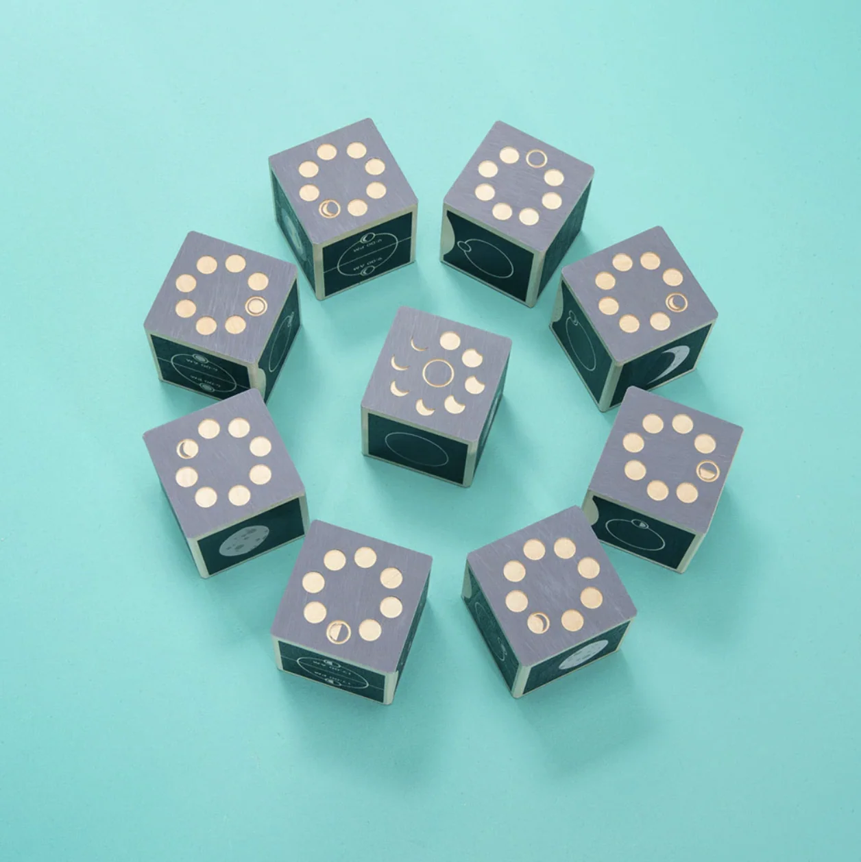 This 9-block set shows each of the 8 moon phases. Two debossed sides feature a moon phase and its cycle location. Four printed sides reveal the moon's rise & set times, tidal effects, a phase illustration, and the moon's location in relation to the sun. This set also includes one bonus block devoted to the lunar eclipse.